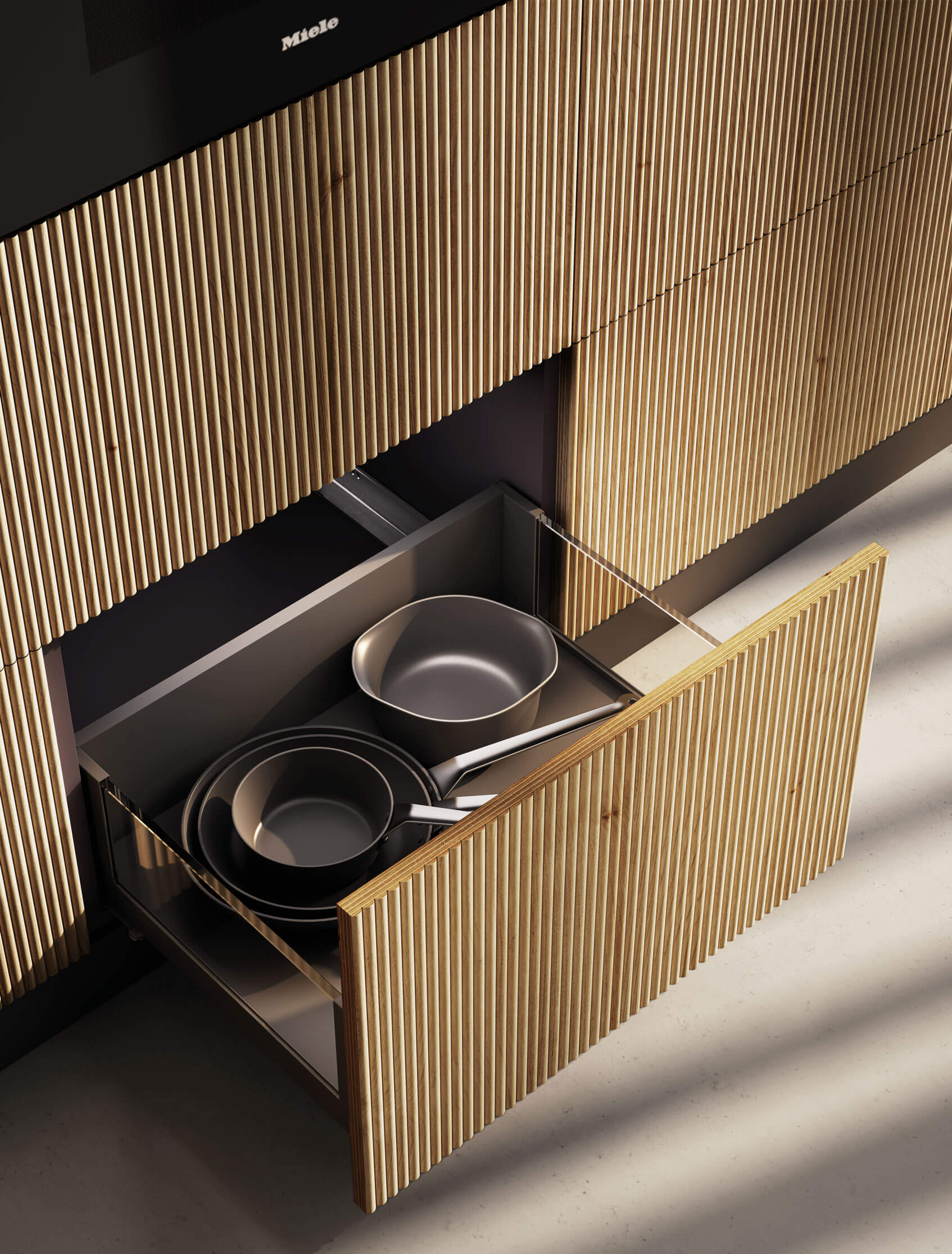 Gracias al sistema de tirador push los cajones quedan totalmente integrados en el conjunto. El resultado es despejado, luminoso y funcional.