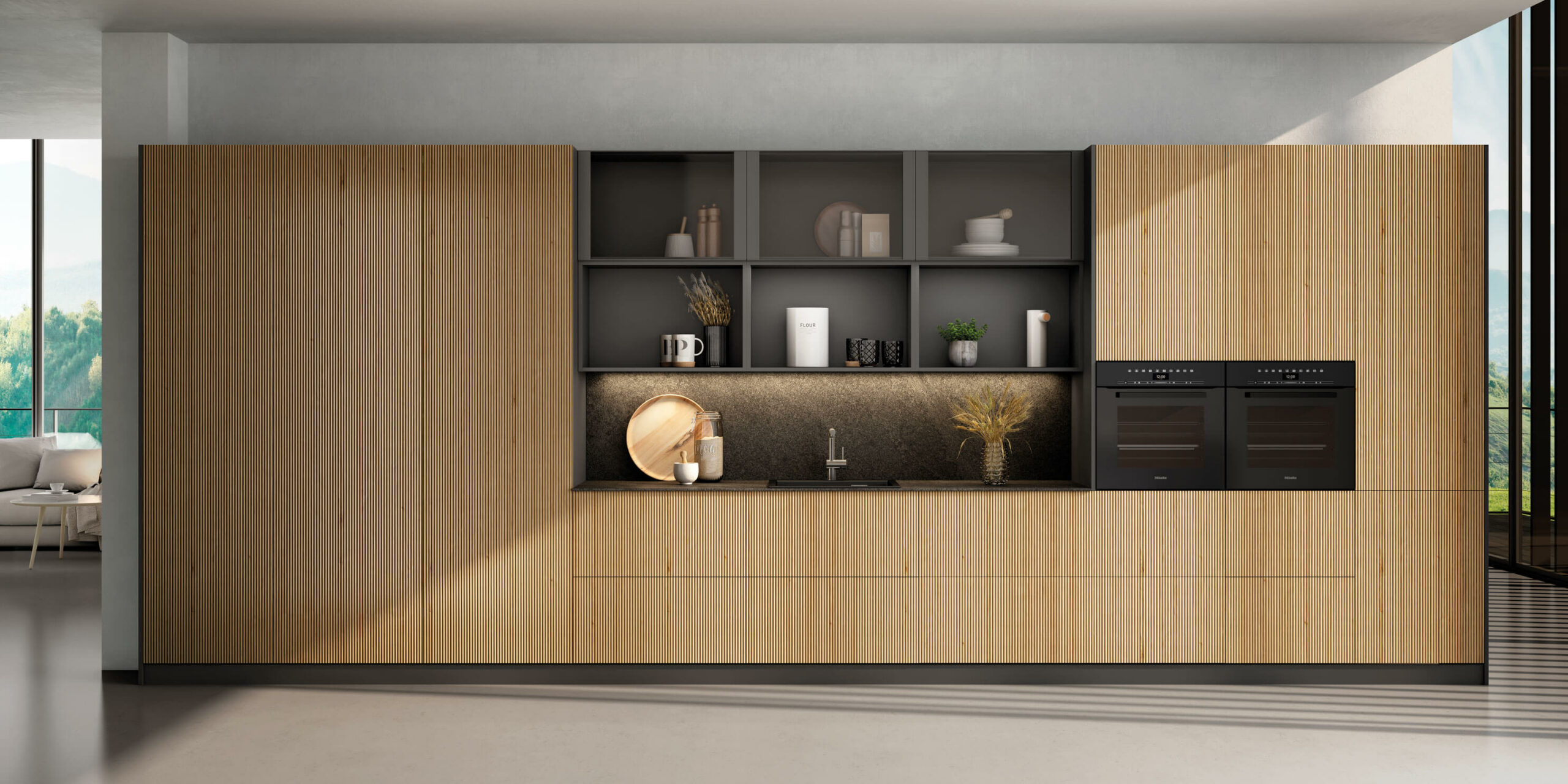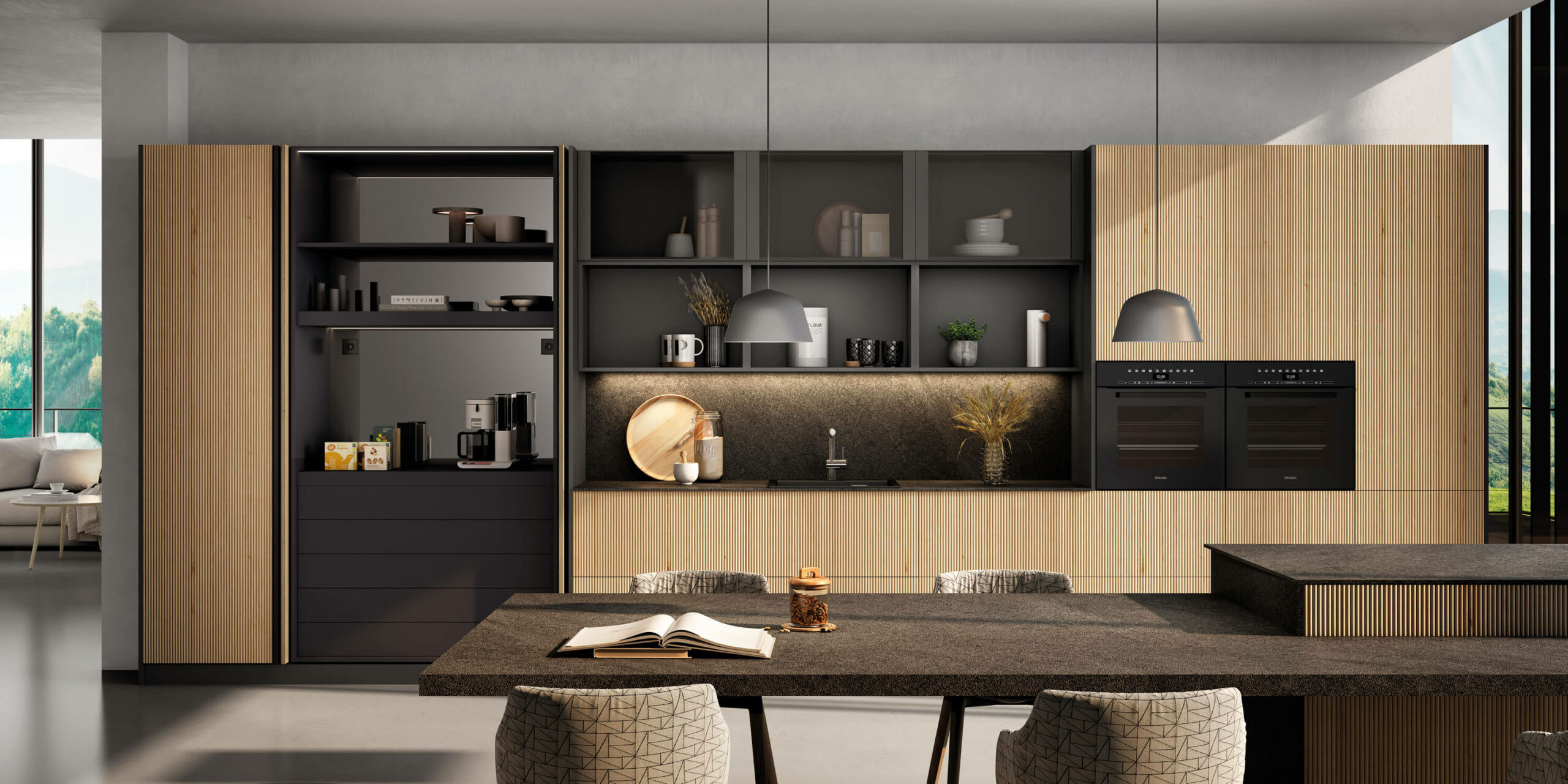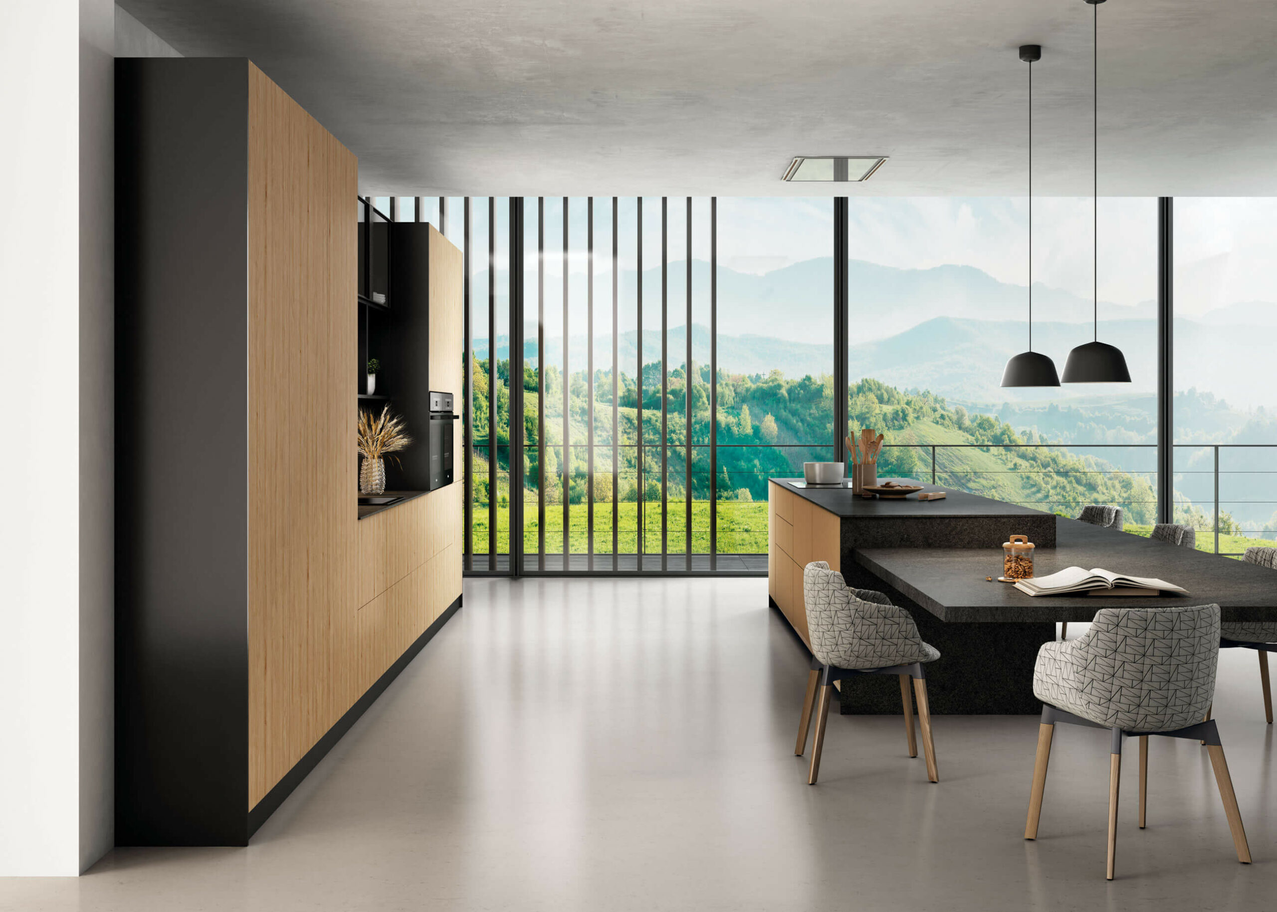El diseño de líneas limpias en roble claro aumenta la sensación de espacio y crea un elegante contraste con la superficie oscura de la isla.