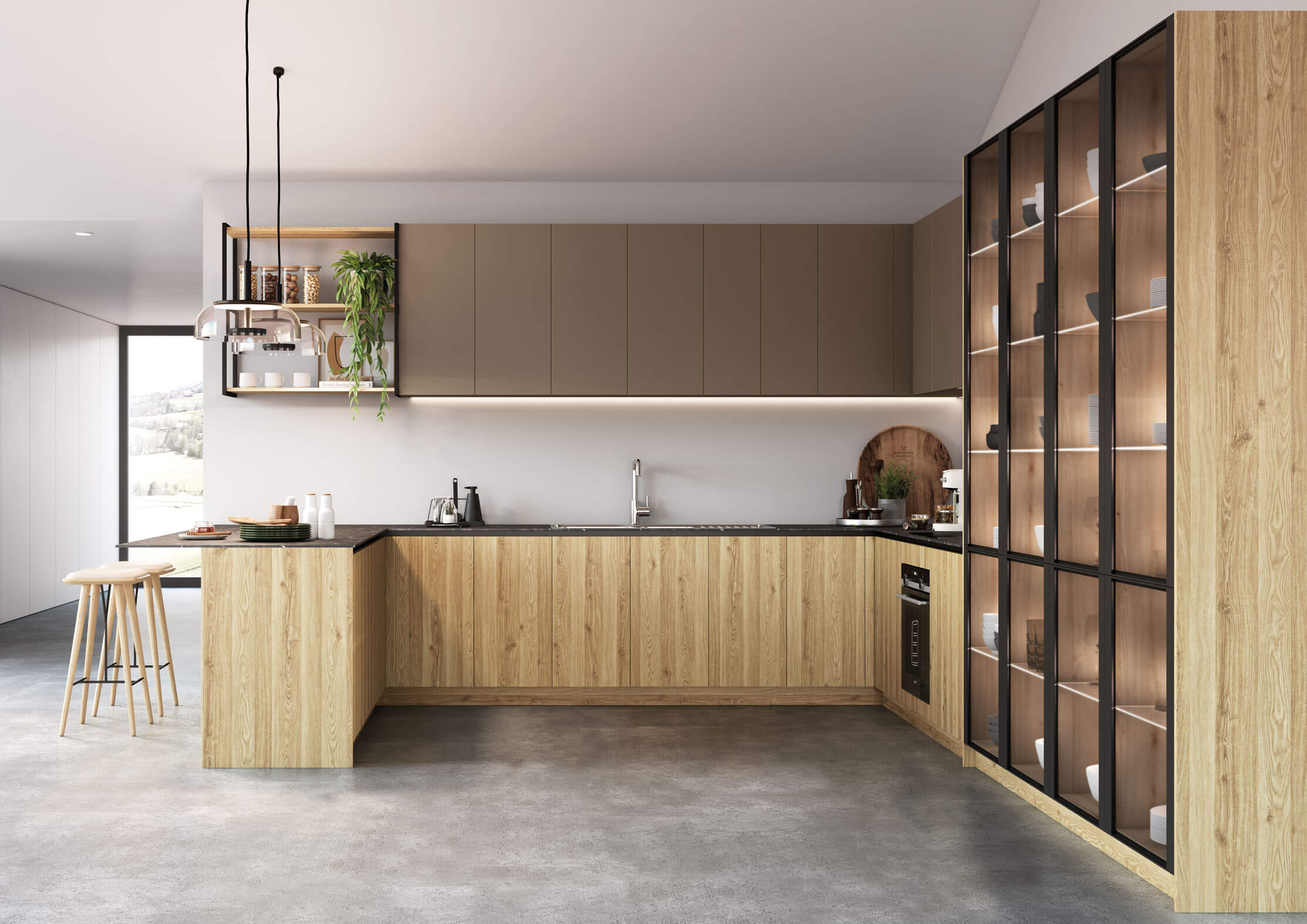 Sofisticación y simplicidad se alían en el diseño y combinan el roble claro con detalles en color negro para conseguir un aire cosmopolita.