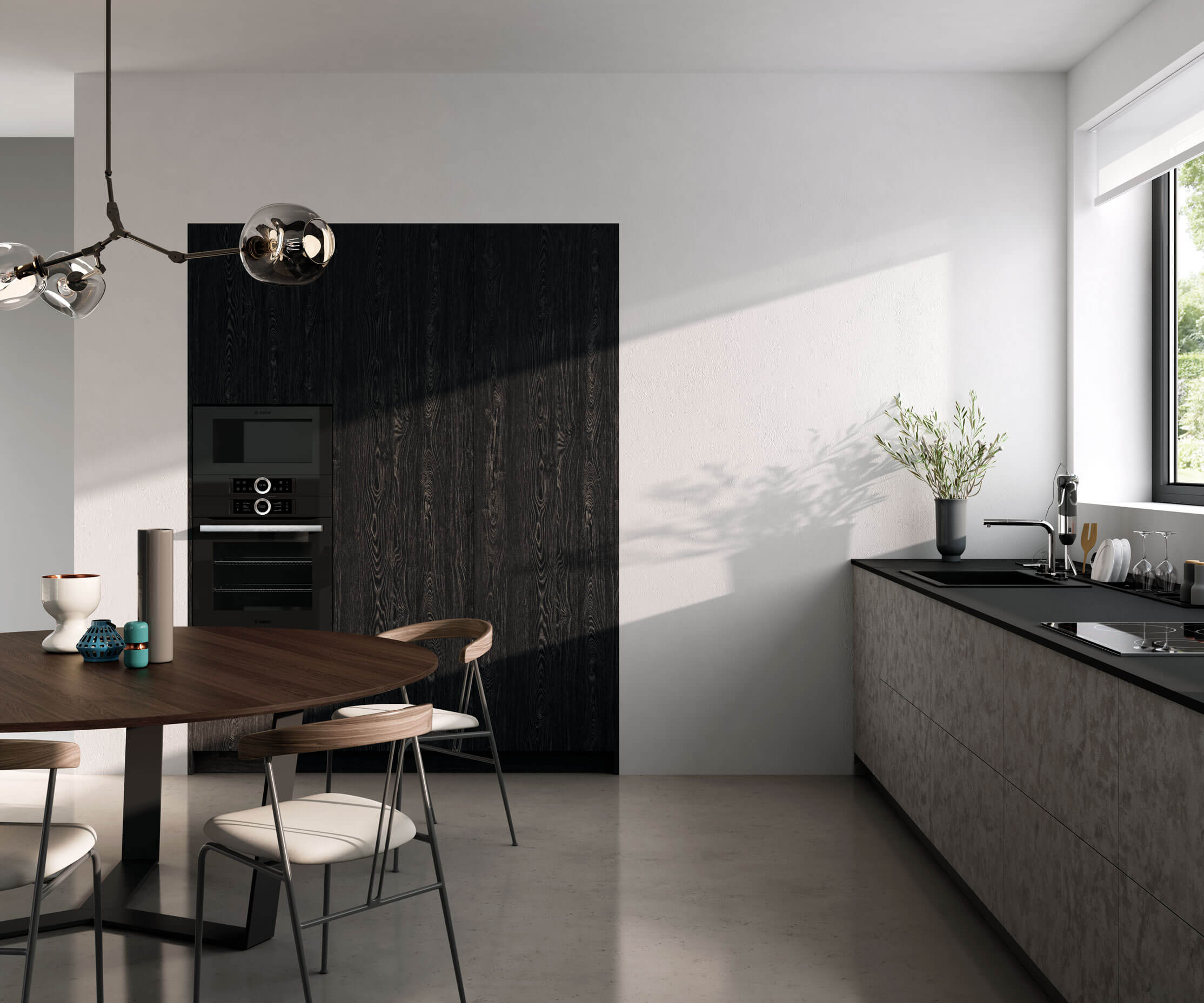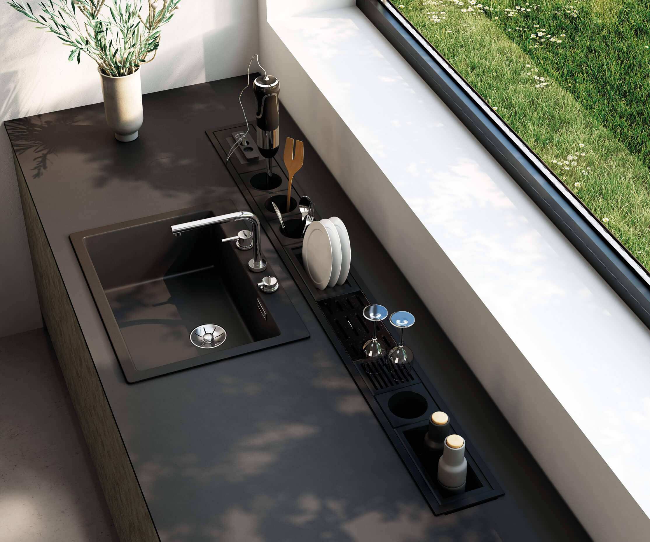 El diseño propone un espacio de serena personalidad donde los elementos funcionales, más que integrarse, se funden en las superficies.