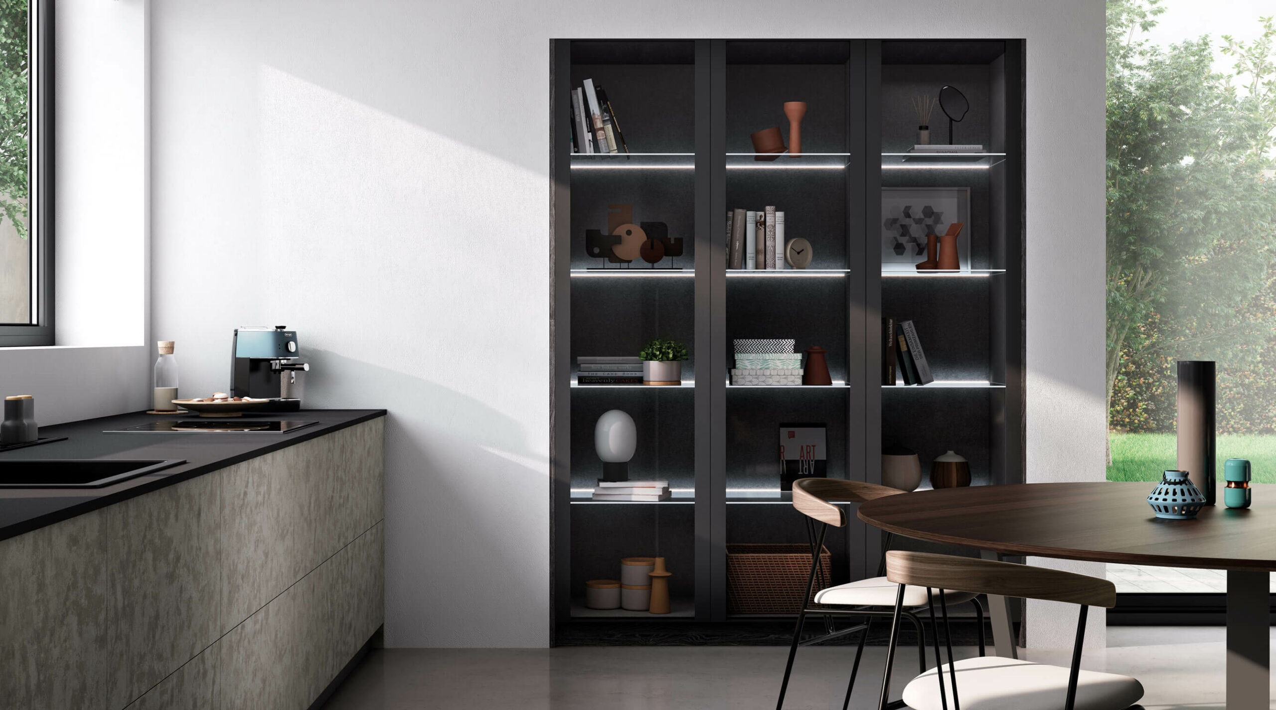 La sobriedad de los bloques de color de los frentes se suaviza con el cristal de la vitrina oscura, ubicada en un punto destacado en contraste con la pared.