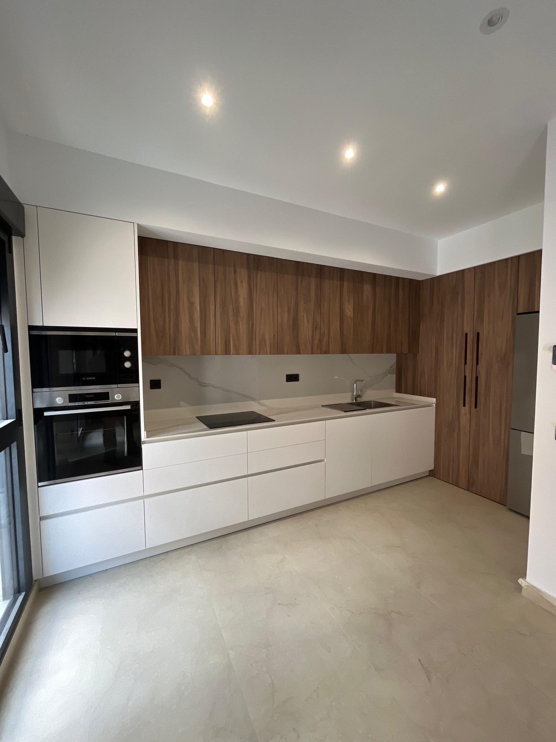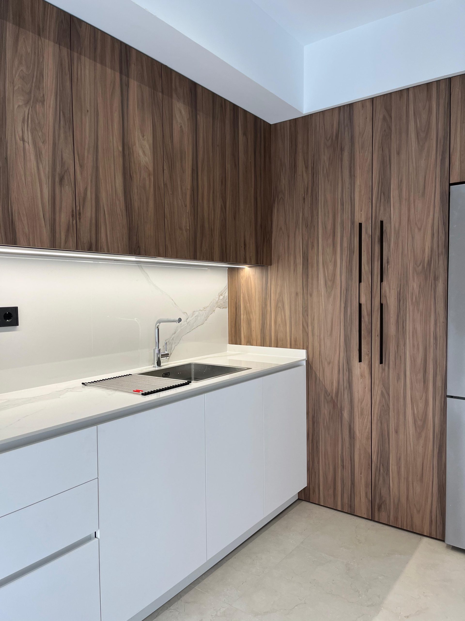 La combinación perfecta de madera y blanco para una cocina que respira estilo y serenidad.
