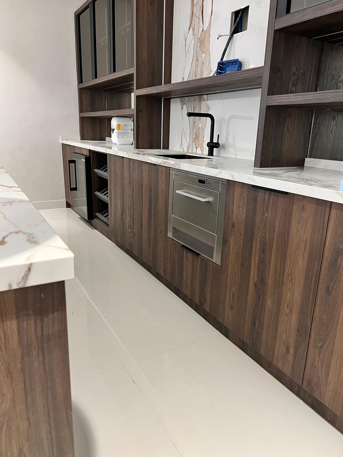 Madera oscura, laminados con visual de mármol y tecnología de vanguardia.